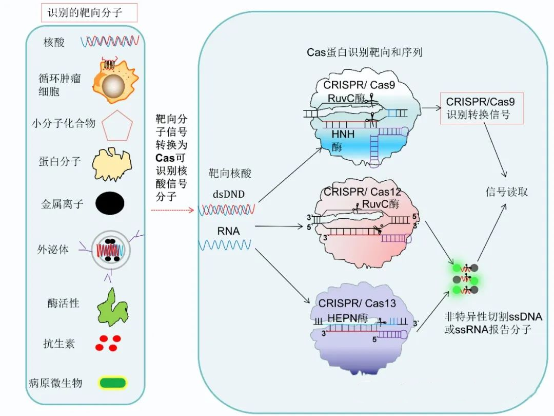 CRISPR/Cas系統在引導RNA(guide RNA,gRNA)的引導下識別目標核酸(DNA/RNA)序列后,激活Cas蛋白對靶向和非靶向核酸(DNA/RNA)分子切割。CRISPR/Cas系統在靶向識別和切割過程中轉化靶標核酸分子信號為檢測儀器或肉眼可觀察的信號。